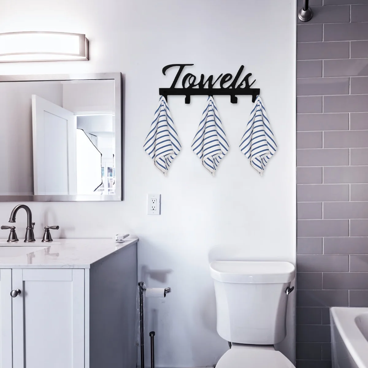 - Fashionable “TOWELS” letter design, farmhouse style, simple and beautiful|Has five independent hooks that store small personal items such as towels, bath towels, clothes, keys, etc.|Made of high-quality metal, waterproof and anti-rust, solid and durable, can be used for a long time|Suitable for the kitchen or bathroom, can be used to hang kitchen towels or light clothes such as pajamas and bathrobes